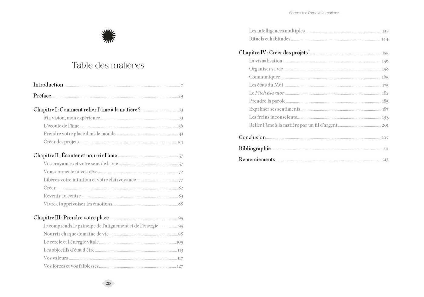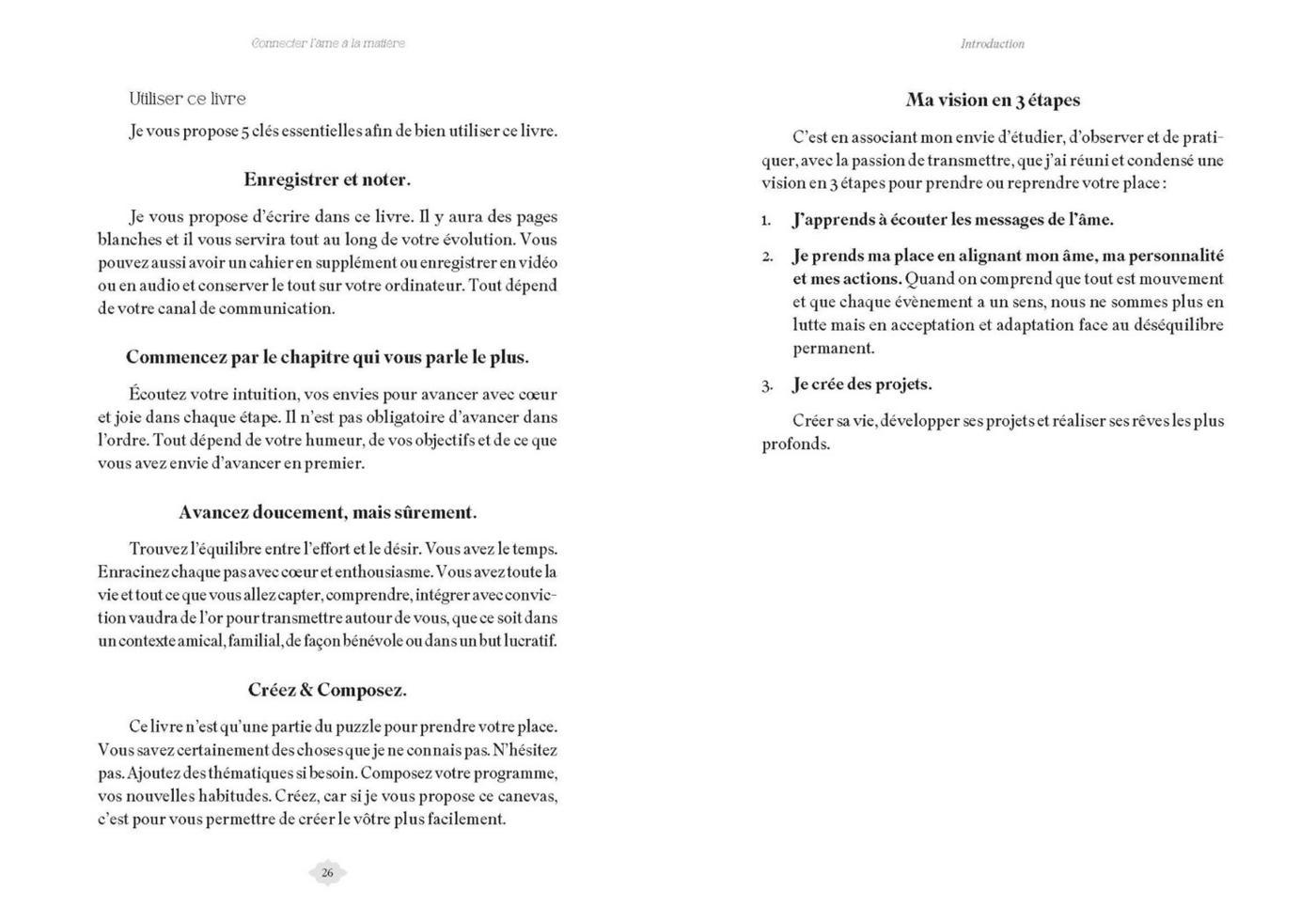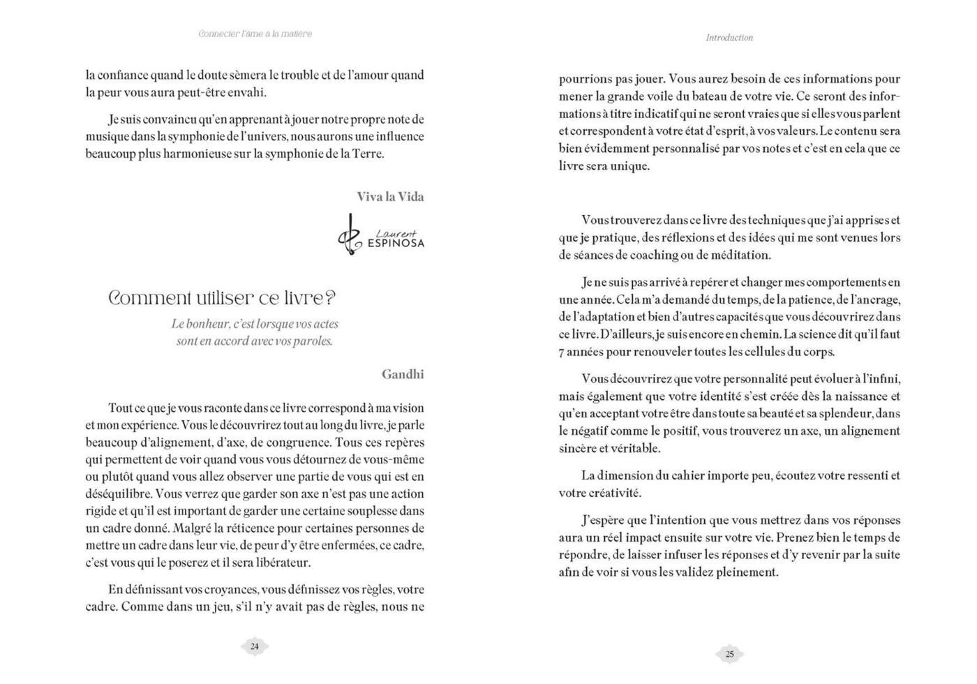 Au travers de sa vision de la vie et de son expérience d’entrepreneur et de coach, Laurent Espinosa nous fait bénéficier des meilleurs exercices pour trouver notre façon d’écouter les messages de l’âme et de les connecter à la matière. « Nous sommes des êtres spirituels venus faire une expérience terrestre. » En se connectant à quelque chose de plus grand, il nous invite à prendre notre place dans ce monde en toute autonomie. Retrouvez dans cet ouvrage plus de trente-cinq exercices qui vous aideront à écouter et à nourrir votre âme, à comprendre le principe de l’alignement et de l’énergie, à vous recentrer, à apprivoiser vos émotions, à reconnaître vos forces et vos faiblesses, à déceler les freins inconscients, à créer des projets en toute sérénité.