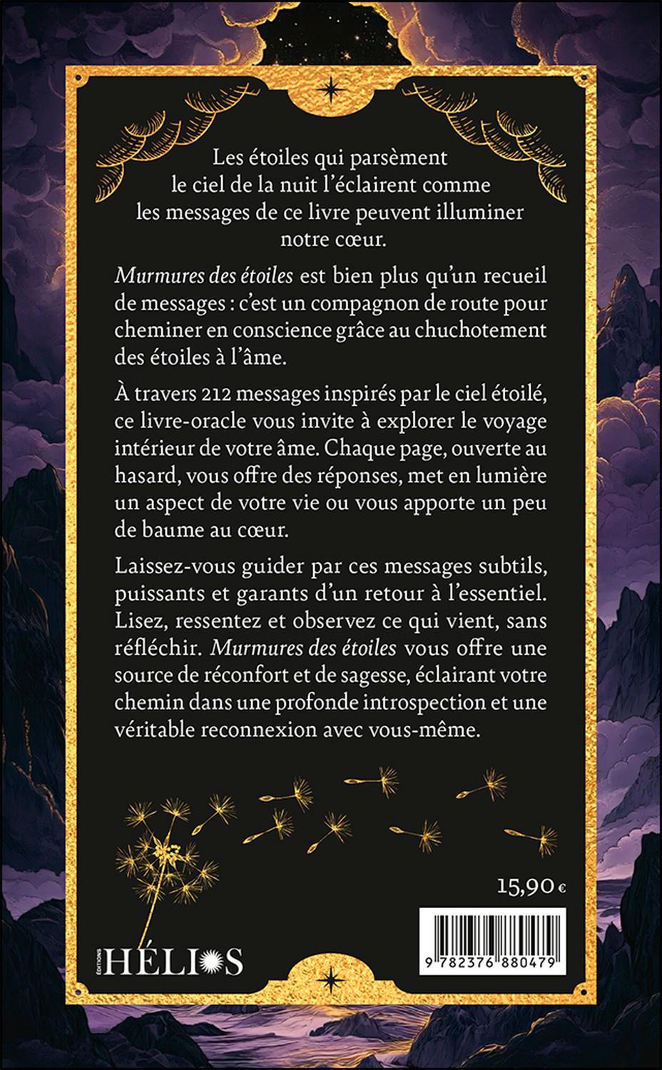 Les étoiles qui parsèment le ciel de la nuit l’éclairent comme les messages de ce livre peuvent illuminer notre cœur. Murmures des étoiles est bien plus qu’un recueil de messages : c'est un compagnon de route pour cheminer en conscience grâce au chuchotement des étoiles à l’âme. À travers 212 messages inspirés par le ciel étoilé, ce livre-oracle vous invite à explorer le voyage intérieur de votre âme. Chaque page, ouverte au hasard, vous offre des réponses, met en lumière un aspect de votre vie ou vous apporte un peu de baume au cœur. Laissez-vous guider par ces messages subtils, puissants et garants d’un retour à l’essentiel. Lisez, ressentez et observez ce qui vient, sans réfléchir. Murmures des étoiles vous offre une source de réconfort et de sagesse, éclairant votre chemin dans une profonde introspection et une véritable reconnexion avec vous-même.